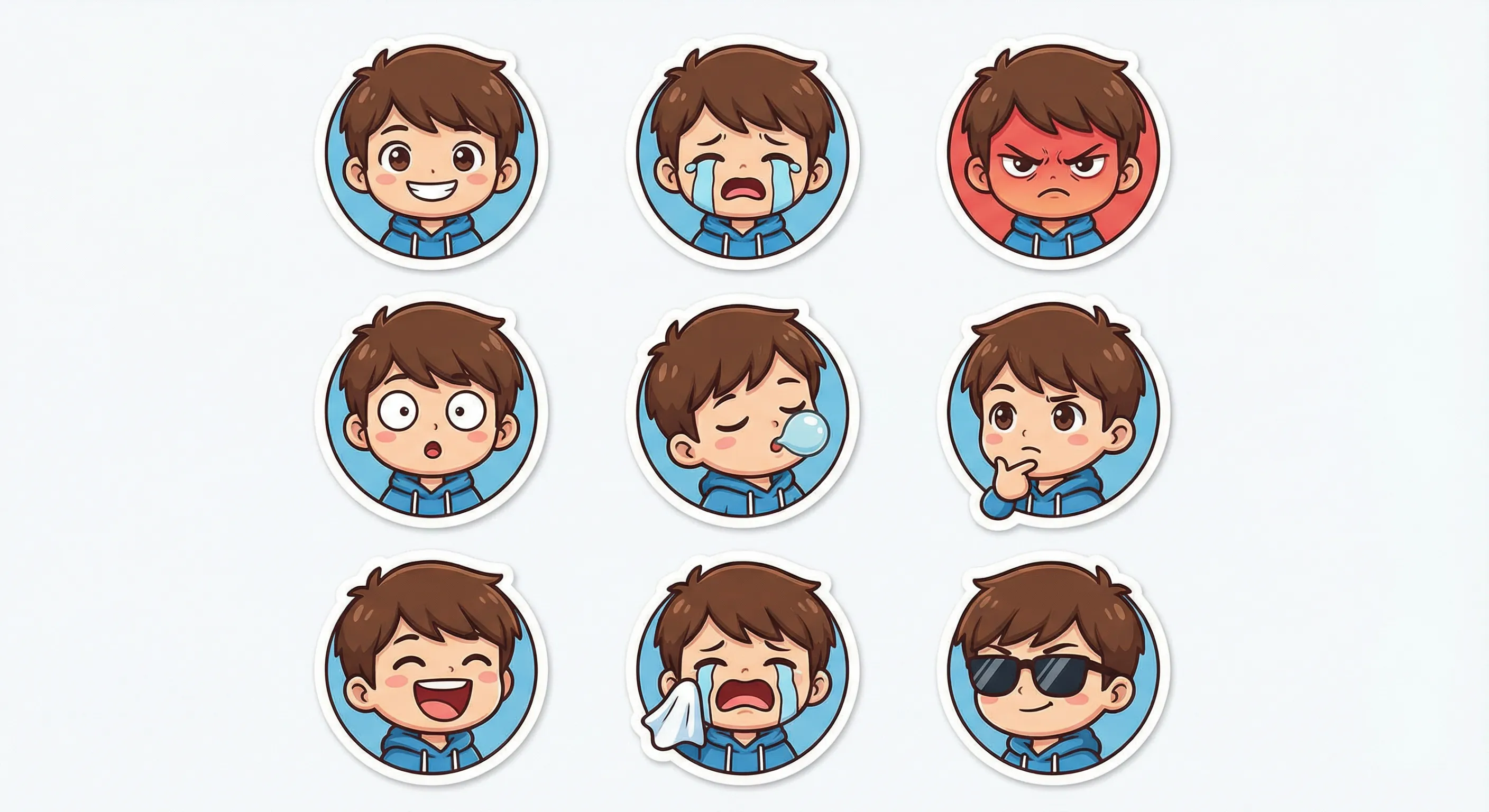 Wil je een aangepast stickerpakket maken voor jezelf of vrienden? Blij, verdrietig, verrast, onverschillig... Een set expressies van hetzelfde personage heeft alleen ziel als het daadwerkelijk hetzelfde personage is. Als elke expressie een ander gezicht heeft, hoe is dat dan een "serie"?